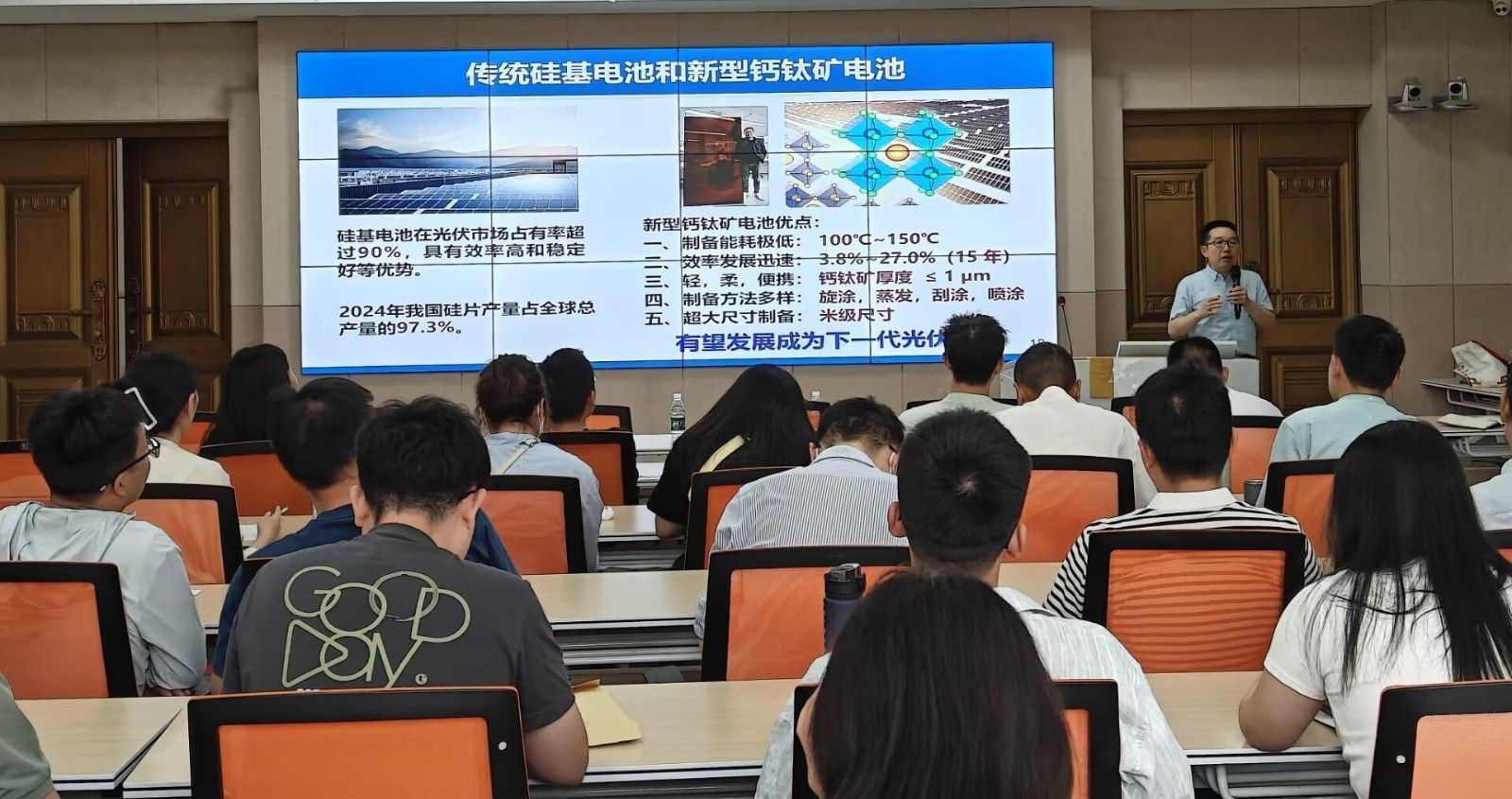 刘治科教授指出,钙钛矿太阳能电池作为第三代太阳能电池,具有高效率、低成本等优势,但晶体缺陷问题限制了其性能和稳定性。他分享了团队在晶体生长调控和缺陷钝化策略方面的成果:通过离子液体表面钝化和体相维度工程,CsPbI2Br PSCs效率超17.5%;利用硅基乙烷钝化,CsPbI3 PSCs效率突破22.0%,室内光伏效率超44.0%;开发新型硫脲异构体材料,使无MA基FACsPbI3 PSCs效率超26.0%,实现3000小时无衰减运行;新型自组装单分子膜(SAM)材料助力倒置钙钛矿电池效率达26.4%。