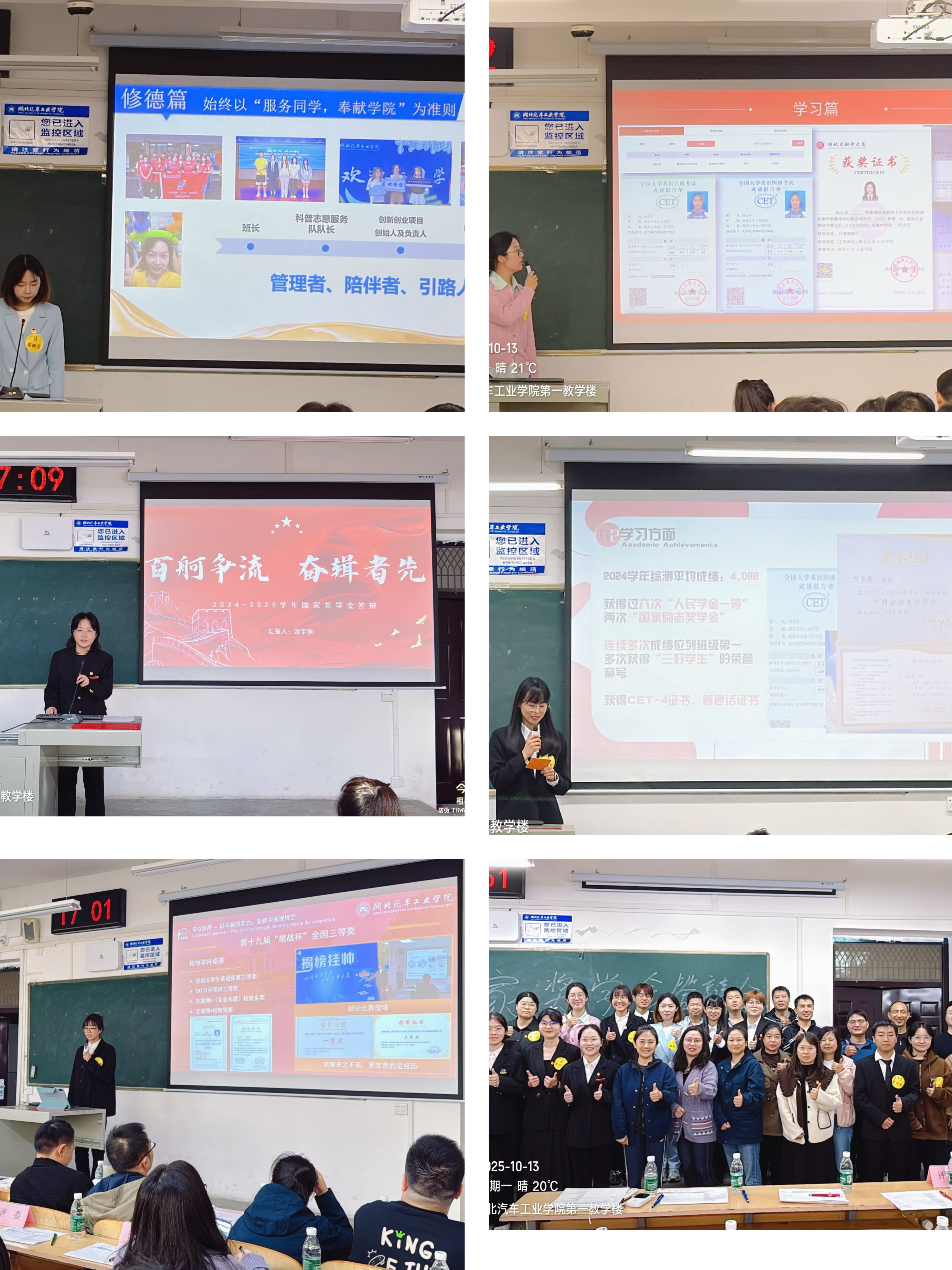 答辩现场,选手们着装整齐、精神饱满,通过PPT全面展示了个人成长历程,4.0以上的优异绩点彰显了扎实的专业基础,数百小时的志愿服务体现了青年的责任担当,跨学科竞赛奖项与科研实践成果则充分展现了创新能力和综合素质。其中,党员及预备党员学子以实际行动践行初心,用真挚感人的故事打动了在场的每一位师生。