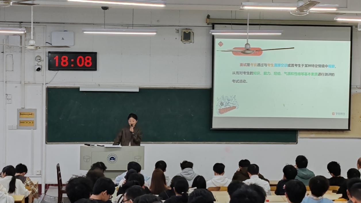吴雨琪结合当前考公考编竞争趋势,详细分析了公务员与事业单位的工作内容、晋升机制及福利待遇,并针对光电工程专业特点,推荐了如电子信息监管、科研院所技术岗等适配度较高的岗位类型。在考试内容与备考方法方面,吴雨琪以行测、申论及事业单位公共基础知识为核心,拆解了各模块的题型特点与高频考点,强调“分阶段复习法”的重要性,建议学生通过思维导图整理知识点、利用错题本提升实战能力。通过近年招录数据对比,指导学生如何筛选竞争压力小、专业匹配度高的岗位,并模拟结构化面试场景,传授逻辑表达与临场应变技巧。现场互动环节中,学生围绕备考时间规划、基层岗位发展等问题踊跃提问,吴雨琪逐一解答并赠送个性化备考建议。