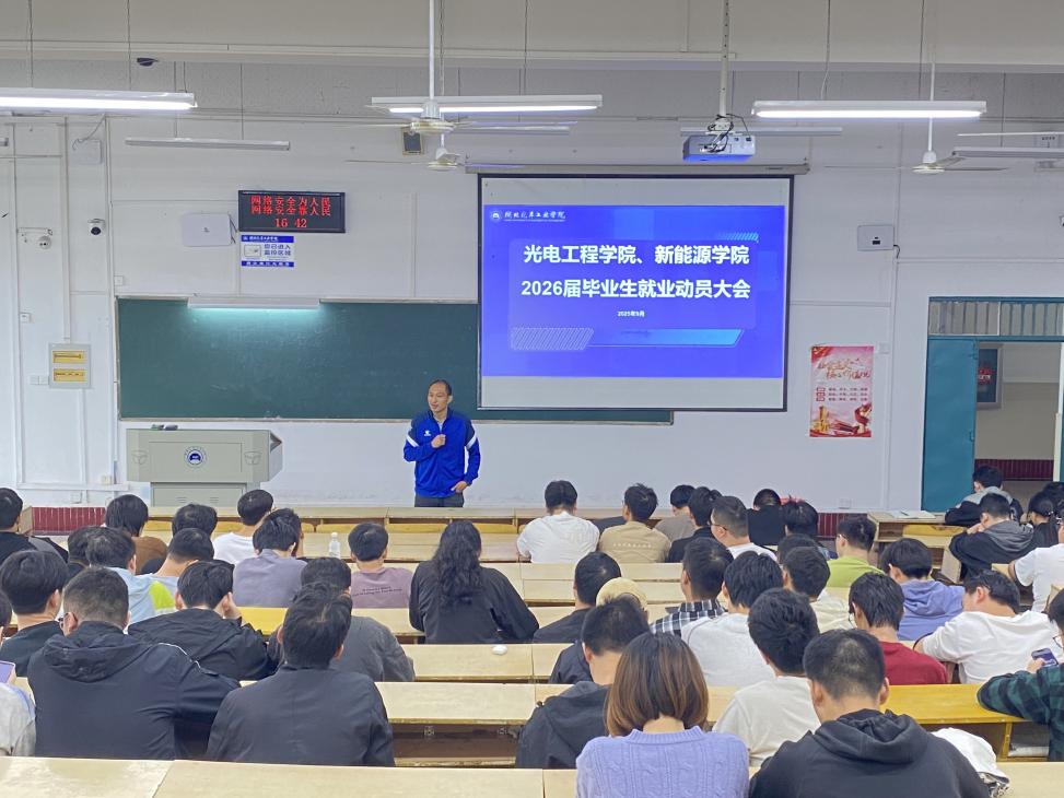 为帮助2026届毕业生明晰就业方向、树立正确的就业观,筑牢就业安全防线,9 月 19 日下午,光电工程学院、新能源学院召开 2026届毕业生就业动员大会。学院党委副书记张朋刚、团委书记秦运来、就业工作辅导员王淑君及全体2026 届毕业生参会。
