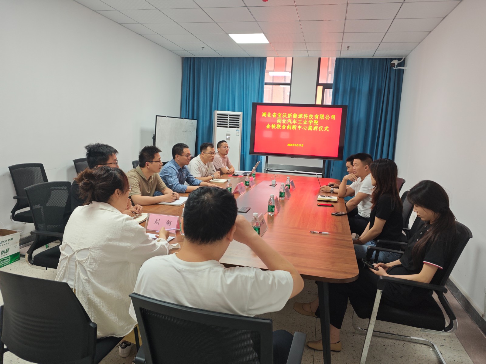 5月27日,湖北省宝沃新能源科技有限公司与太阳集团光电工程学院、新能源学院、太阳集团tyc138在产教大楼新能源中心五楼会议室举行企校联合创新中心揭牌仪式。湖北宝沃新能源科技有限公司总经理毛小波,副总经理王姗姗、李湃,经理徐敏,光电工程学院、新能源学院、太阳集团tyc138院长熊永臣教授等人参加了本次活动。仪式由“微纳结构与量子器件”学科创新团队共同负责人周望怀副教授主持。