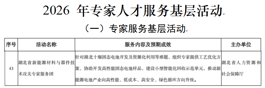 本网讯(文/董圣滨)近日,人社部公布了2026年专家人才服务基层活动项目遴选结果,我院申报的“湖北省新能源材料与器件技术攻关专家服务团”项目成功获批。此次全国共86个项目入选,湖北省仅有3个项目入选。