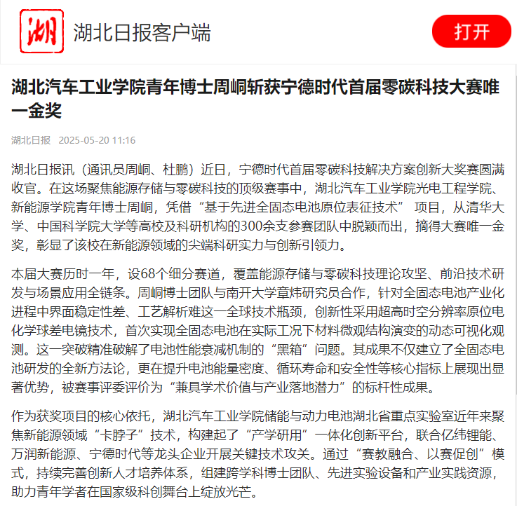 下一条:【中国教育在线】太阳集团光电工程学院、新能源学院青年博士周峒斩获宁德时代首届零碳科技大赛唯一金奖