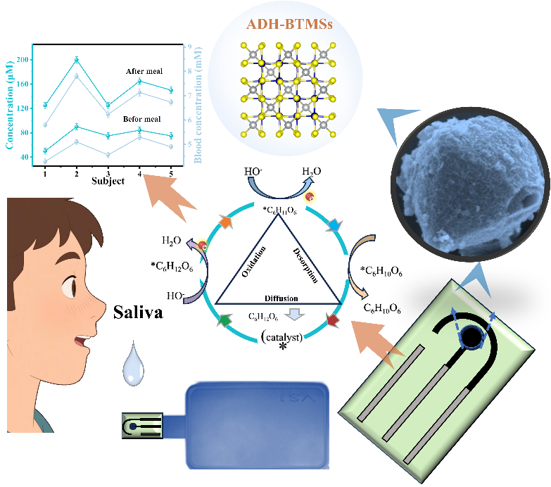 该研究通过非晶工程,调控传感界面的葡萄糖反应能垒,成功构建一种高灵敏度的微型便携式唾液血糖传感器件。理论计算和实验共同证实了发展的传感平台有效克服葡萄糖氧化的速率限制步(脱质子),同时调控脱附能垒,进而促进产物解离,显著提高反应动力学。该便携式电化学传感器对唾液中的葡萄糖具有高催化活性,成功实现非侵入性血糖监测,检测结果与商用血糖仪的检测结果一致。